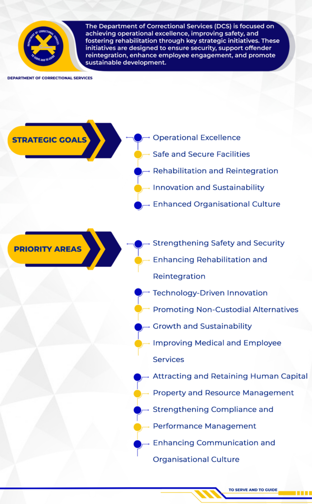 The Department of Correctional Services (DCS) has adopted a strategic framework aimed at transforming its operations, enhancing public safety, and strengthening its rehabilitative impact. Guided by clearly defined Strategic Goals and aligned Priority Areas, the Department is focused on building a correctional system that is efficient, secure, humane, and future-ready. These focus areas not only reflect the DCS’s commitment to national development goals but also underscore its role in fostering meaningful change within the lives of offenders, staff, and the wider community. Through this approach, the Department is positioning itself to deliver measurable outcomes, improve accountability, and support sustainable transformation across all levels of its operations.